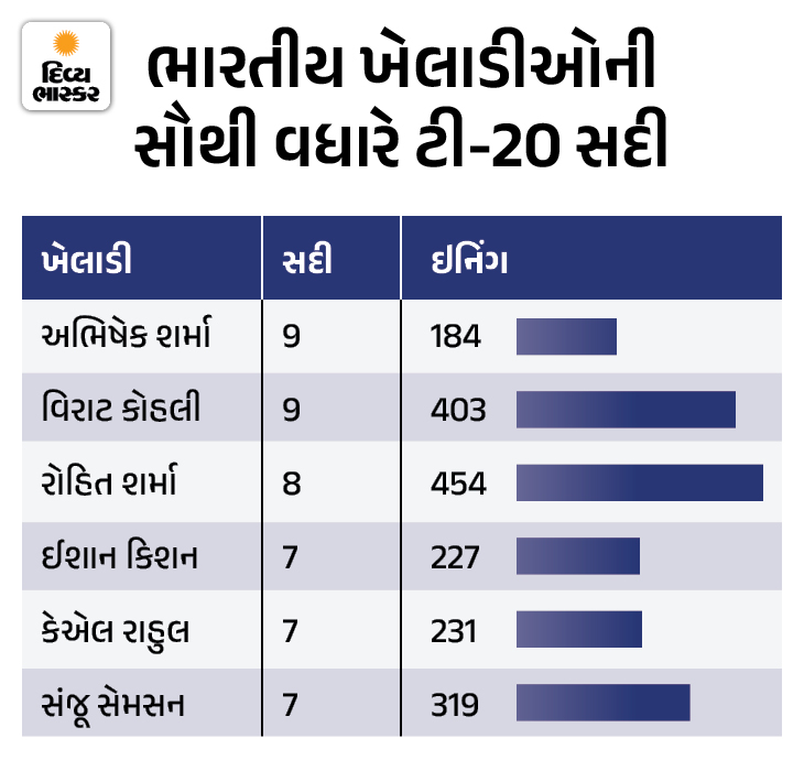અભિષેક શર્માની ટી-20માં 9 સદી પૂરી થઈ ગઈ. તેણે આ સિદ્ધિ 184 ઇનિંગ્સમાં હાંસલ કરી, જે ભારતીયોમાં સૌથી ઝડપી છે. કોહલીને અહીં સુધી પહોંચવામાં 403 ઇનિંગ્સ લાગી હતી.