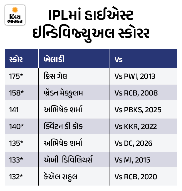 અભિષેક શર્માએ IPLમાં અણનમ 135 રન બનાવીને કેએલ રાહુલ (132*)ને પાછળ છોડી દીધા છે. તેઓ IPLના હાઈએસ્ટ ઇન્ડિવિજ્યુઅલ સ્કોરરની યાદીમાં બીજી વખત સામેલ થયા છે. આ પહેલા ગયા વર્ષે તેમણે 141 રનની ઇનિંગ રમી હતી.