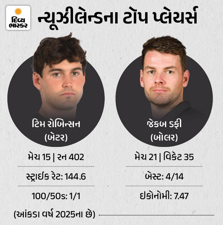 ન્યૂઝીલેન્ડ (NZ): મિચેલ સેન્ટનર (કેપ્ટન), રચિન રવીન્દ્ર, ડેવોન કોનવે, ટિમ રોબિન્સન, ડેરીલ મિચેલ, ગ્લેન ફિલિપ્સ, જિમી નીશમ, માર્ક ચેપમેન (વિકેટકીપર), માઈકલ બ્રેસવેલ, ઈશ સોઢી, મેટ હેનરી અને જેકબ ડફી.