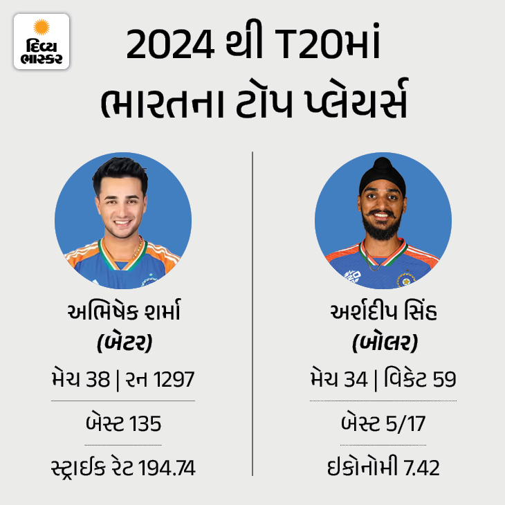 2024 પછી અભિષેક શર્મા ભારત તરફથી સૌથી વધુ રન બનાવનાર બેટર છે. તેણે 38 મેચમાં 194.74ના સ્ટ્રાઈક રેટથી 1297 રન બનાવ્યા છે. જ્યારે, અર્શદીપ સિંહ 34 મેચમાં 59 વિકેટ લઈ ચૂક્યો છે.
