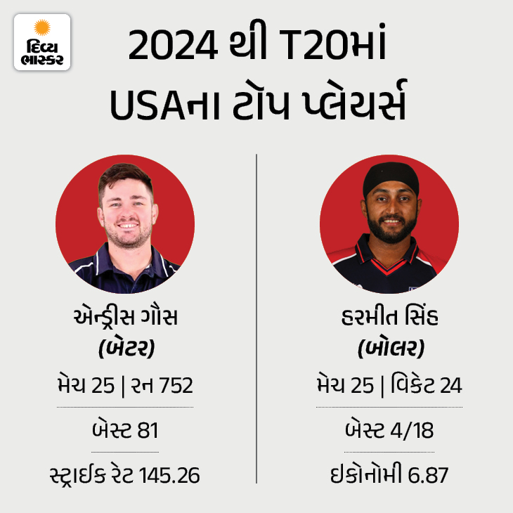 એન્ડ્રીઝ ગૌસ અમેરિકાનો ટૉપ સ્કોરર છે. તેણે 2024 પછી 25 મેચમાં 752 રન બનાવ્યા છે. 81 રન તેનો શ્રેષ્ઠ સ્કોર છે. બોલિંગમાં હરમીત સિંહે 25 મેચમાં 24 વિકેટ લીધી છે. તે ટીમનો ટૉપ વિકેટ ટેકર બોલર છે.