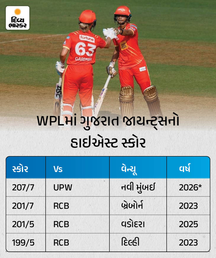 ગુજરાતની ઇનિંગની છેલ્લી ઓવરમાંથી 14 રન આવ્યા. ભારતી ફૂલમાળીએ દીપ્તિ શર્માના ત્રીજા અને ચોથા બોલ પર સતત બે છગ્ગા ફટકાર્યા. આનાથી ટીમનો સ્કોર 207 રન સુધી પહોંચી ગયો.