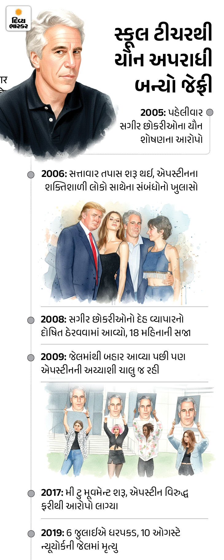 જેફ્રી એપસ્ટીન ન્યૂયોર્કનો કરોડપતિ ફાઇનાન્સર હતો. તેની મોટા નેતાઓ અને સેલિબ્રિટીઓ સાથે મિત્રતા હતી. તેના પર 2005માં સગીર છોકરી સાથે યૌન શોષણનો આરોપ લાગ્યો હતો. 2008માં તેને સગીર પાસે સેક્સની માંગણી કરવા બદલ દોષી ઠેરવવામાં આવ્યો હતો. તેને 13 મહિનાની જેલ થઈ હતી.