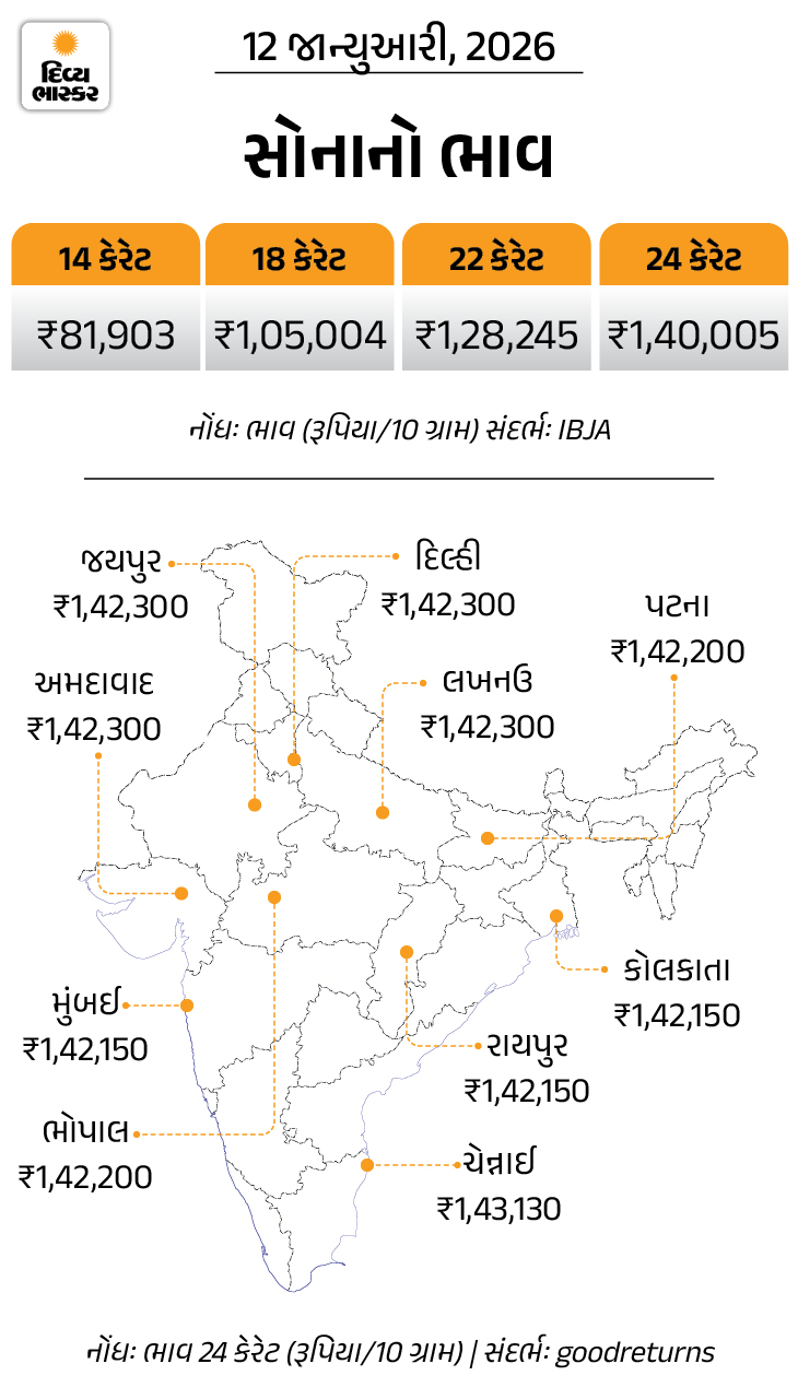 Gold Price Today 12 January 2026; 24 Carat Gold Reaches New All Time High 140005 PHOTOS | ચાંદીના ભાવમાં આજે રેકોર્ડ બ્રેક વધારો: એક જ દિવસમાં રૂ.14,000નો વધારો, સોનાનો ભાવ પણ વધી રૂ.1.40 લાખે પહોંચ્યો; જાણો હજી કેટલા ભાવ વધી શકે