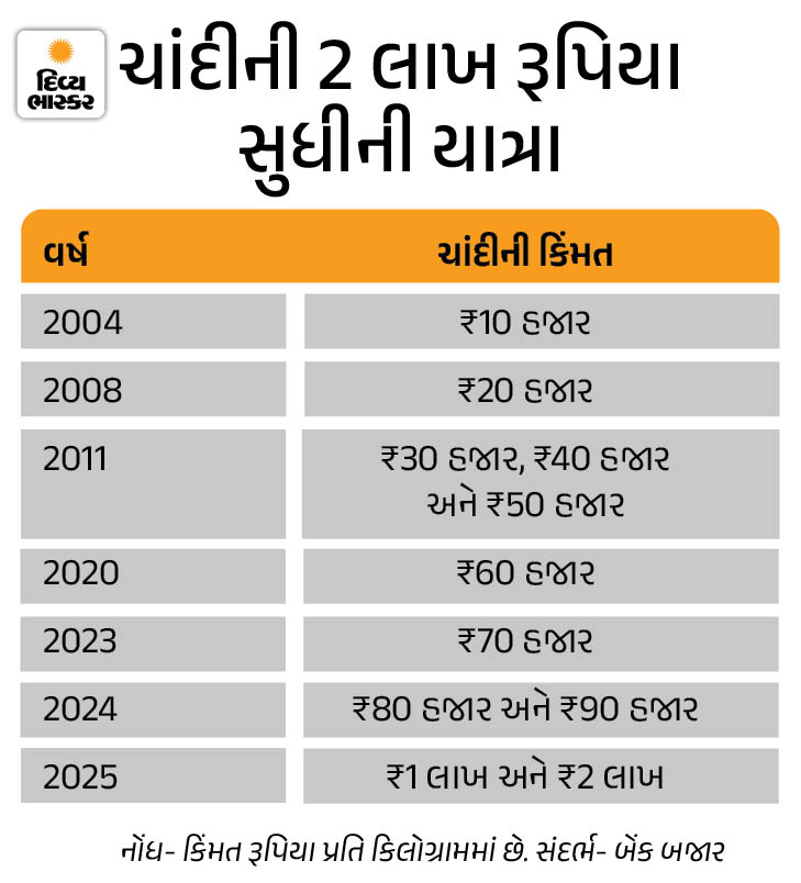 - ચાંદીનો ભાવ પણ આ સમયગાળા દરમિયાન 1,44,403 રૂપિયા (167%) વધ્યો. 31 ડિસેમ્બર 2024ના રોજ એક કિલો ચાંદીની કિંમત 86,017 રૂપિયા હતી, જે આ વર્ષના છેલ્લા દિવસે 2,30,420 રૂપિયા પ્રતિ કિલો થઈ ગઈ.