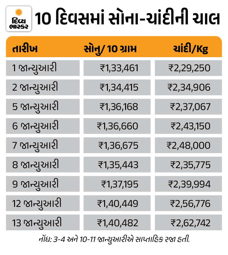 બે દિવસમાં ચાંદી લગભગ 20 હજાર રૂપિયા મોંઘી થઈ ગઈ છે, જ્યારે 10 ગ્રામ 24 કેરેટ સોનાનો ભાવ 33 રૂપિયા વધીને 1,40,482 રૂપિયાના ઓલટાઈમ હાઈ પર પહોંચી ગયો છે. ગઈકાલે એ 1,40,449 રૂપિયા પ્રતિ 10 ગ્રામ હતો.