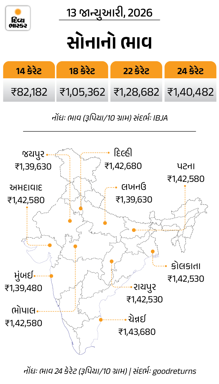 - ગયા વર્ષે એટલે કે 2025માં સોનાની કિંમત 57,033 રૂપિયા (75%) વધી છે. 31 ડિસેમ્બર 2024ના રોજ 10 ગ્રામ 24 કેરેટ સોનું 76,162 રૂપિયાનું હતું, જે 31 ડિસેમ્બર 2025ના રોજ 1,33,195 રૂપિયા થઈ ગયું.