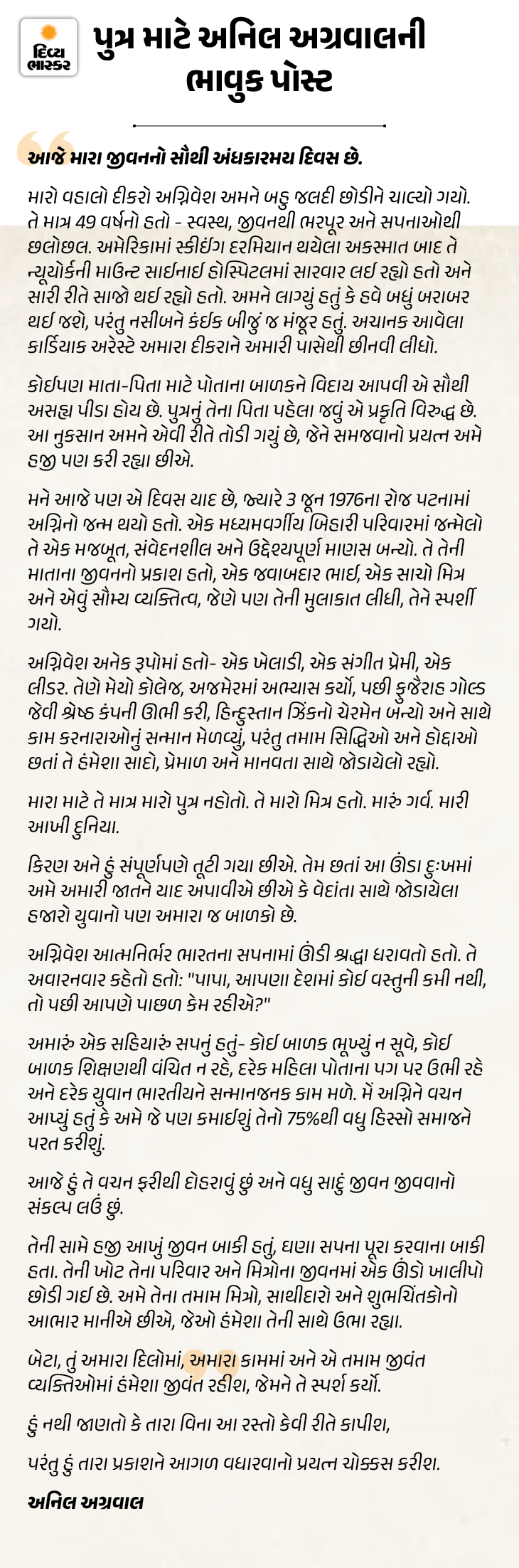 વાંચો પુત્ર અગ્નિવેશ માટે અનિલ અગ્રવાલની સંપૂર્ણ પોસ્ટ
