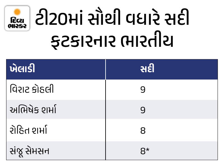 સંજુ સેમસને ટી-20 ક્રિકેટમાં 8મી સદી ફટકારી. સૌથી વધુ સદી ફટકારનારા ભારતીય ખેલાડીઓમાં વિરાટ કોહલી અને અભિષેક શર્મા સૌથી આગળ છે. બંનેના નામે 9-9 સદી નોંધાયેલી છે. ત્યારબાદ રોહિત શર્માનું નામ આવે છે, જેમણે ટી-20માં અત્યાર સુધી 8 સદી ફટકારી છે.