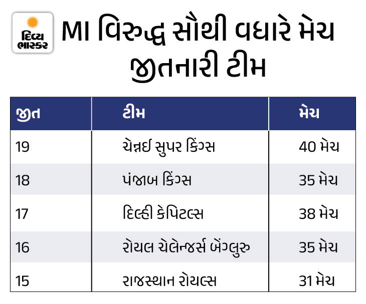 ચેન્નઈએ મુંબઈને IPLમાં 19મી વખત હરાવ્યું. આ સાથે જ CSK મુંબઈને સૌથી વધુ મેચ હરાવનારી ટીમ બની ગઈ છે. તેણે MI સામે કુલ 40માંથી 19 મેચ જીતી છે. ત્યારબાદ પંજાબ કિંગ્સ છે, જેમણે 35 મેચમાંથી 18 જીત મેળવી છે. દિલ્હી કેપિટલ્સ 38 મેચમાં 17 જીત સાથે ત્રીજા નંબર પર છે.