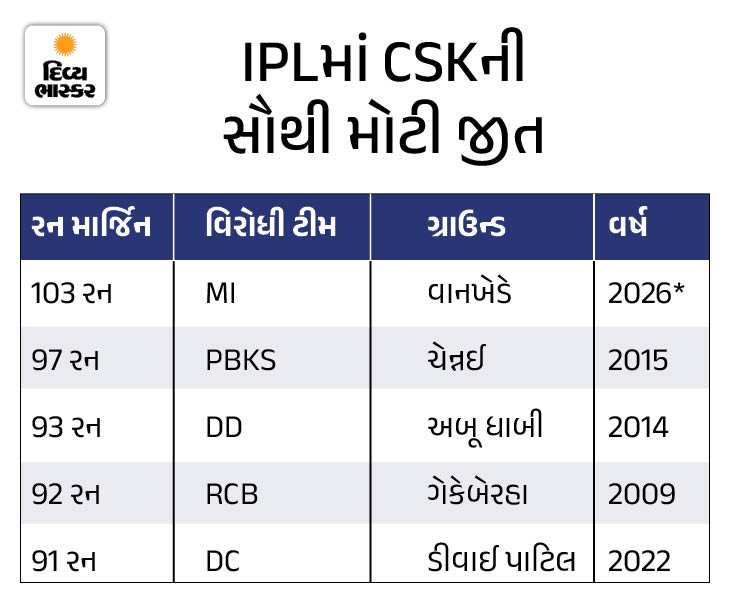 ચેન્નઈ સુપર કિંગ્સે મુંબઈ ઈન્ડિયન્સને 103 રનથી હરાવી દીધું. આ ટુર્નામેન્ટના ઇતિહાસમાં ટીમની સૌથી મોટી જીત છે. આ પહેલા 2014ની સિઝનમાં અબુ ધાબીમાં દિલ્હી ડેરડેવિલ્સ સામે મળેલી 93 રનની જીત તેની સૌથી મોટી જીત હતી.