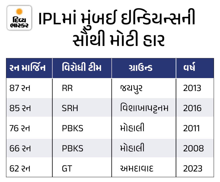 મુંબઈને IPL ઈતિહાસમાં સૌથી મોટી હાર મળી. આ પહેલા 2013માં તેને જયપુરમાં રાજસ્થાન સામે 87 રનની હારનો સામનો કરવો પડ્યો હતો. જ્યારે 2016માં સનરાઈઝર્સ હૈદરાબાદે તેને 85 રનથી હરાવ્યું હતું.