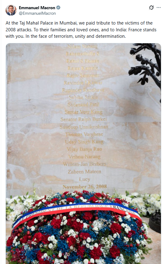 મેક્રોને 26/11 મુંબઈ હુમલામાં માર્યા ગયેલાને શ્રદ્ધાંજલી આપી