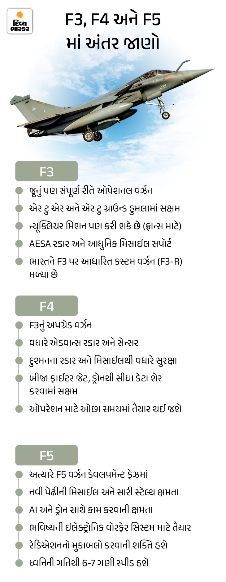 હાલમાં ભારતીય વાયુસેના પાસે જે રાફેલ છે, તે F-3 વેરિઅન્ટ છે અને 4.5 જનરેશન ફાઇટર માનવામાં આવે છે. તેમાં સ્ટેલ્થ ફીચર્સ અને પરમાણુ હથિયારો લઈ જવાની ક્ષમતા પણ છે. નવી ડીલમાં મળનારા મોટાભાગના જેટ F-4 વર્ઝનના હશે, જે વધુ એડવાન્સ સિસ્ટમ અને અપગ્રેડ ટેકનોલોજી સાથે આવશે.