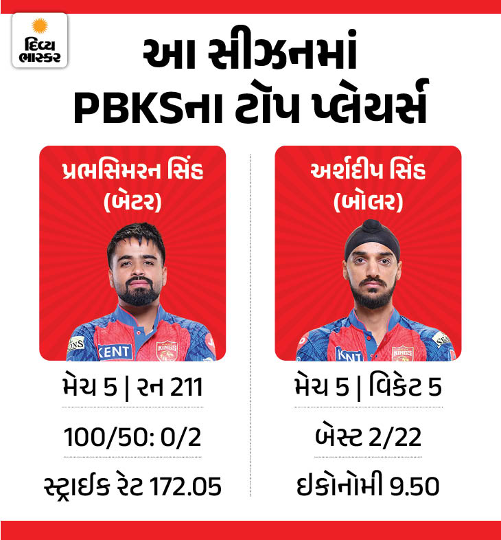 પંજાબ કિંગ્સની સૌથી મોટી તાકાત શ્રેયસ અય્યરની હાજરી છે જે શાનદાર કેપ્ટનશીપ કરી રહ્યો છે. આ ઉપરાંત આ સીઝનમાં ટીમ માટે પ્રભસિમરન સિંહ બેટિંગમાં શાનદાર ફોર્મમાં જોવા મળ્યો છે. તેણે 5 મેચમાં 211 રન બનાવ્યા છે, જેમાં 2 અડધી સદી સામેલ છે. તો બોલિંગમાં અર્શદીપ સિંહે 5 મેચમાં 5 વિકેટ ઝડપી છે.