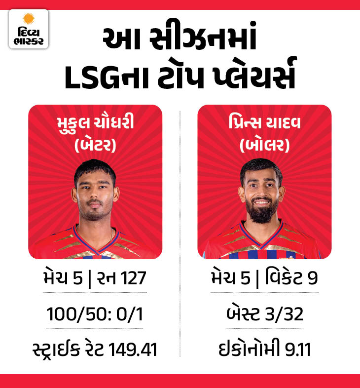 આ સીઝનમાં LSG માટે મુકુલ ચૌધરીએ બેટિંગમાં શાનદાર યોગદાન આપ્યું છે. તેણે 5 મેચમાં 127 રન બનાવ્યા છે, જેમાં 1 અડધી સદી સામેલ છે. જ્યારે બોલિંગમાં પ્રિન્સ યાદવ ટીમ માટે મહત્વનો સાબિત થયો છે, જેણે 5 મેચમાં 9 વિકેટ પોતાના નામે કરી છે.