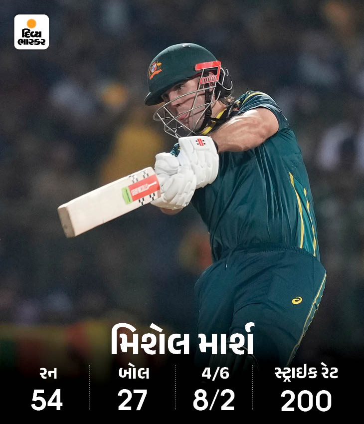 ઓસ્ટ્રેલિયાની બેટિંગ પહેલા બેટિંગ કરતા ઓસ્ટ્રેલિયાની શરૂઆત શાનદાર રહી. ટ્રેવિસ હેડ અને મિશેલ માર્શે પહેલી વિકેટ માટે સદીની ભાગીદારી કરી. પહેલો ફટકો 9મી ઓવરમાં 104 રન પર પડ્યો. જોકે, ઓસ્ટ્રેલિયાની નબળાઈ ઝડપથી ખુલ્લી પડી ગઈ, અને તેઓ 10 ઓવરમાં માત્ર 181 રન જ બનાવી શક્યા. ઓસ્ટ્રેલિયા તરફથી મિશેલ માર્શ અને ટ્રેવિસ હેડ સૌથી વધુ સ્કોરર રહ્યા. હેડે 56 રન બનાવ્યા, જ્યારે માર્શે 54 રન બનાવ્યા.