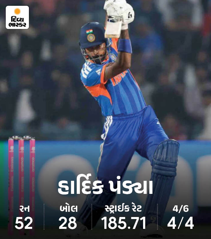 હાર્દિક પંડ્યા 52 રન બનાવીને આઉટ થયો. ગેરાર્ડ ઇરાસ્મસે તેને કેચ આઉટ કરાવ્યો. ઇરાસ્મસને આ ત્રીજી વિકેટ મળી છે. તેણે આ પહેલા તિલક વર્મા (25 રન) અને ઈશાન કિશનને (24 બોલમાં 61 રન) પણ આઉટ કર્યા હતા.