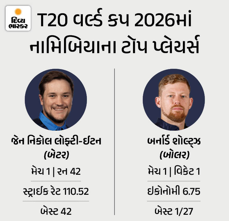નામિબિયાને પોતાની પહેલી મેચમાં નેધરલેન્ડ્સ સામે 7 વિકેટે હારનો સામનો કરવો પડ્યો હતો. ટીમ આજે પણ હારી ગઈ તો તેનું સુપર-8માં એન્ટ્રી કરવું મુશ્કેલ થઈ જશે. પહેલી મેચમાં નામિબિયા માટે જૈન નિકોલ લોફ્ટી-ઈટને 42 રન બનાવ્યા હતા. તેણે એક વિકેટ પણ લીધી હતી. લેફ્ટ આર્મ સ્પિનર બર્નાર્ડ શોલ્ટ્ઝ પણ એક વિકેટ લેવામાં સફળ રહ્યો હતો.