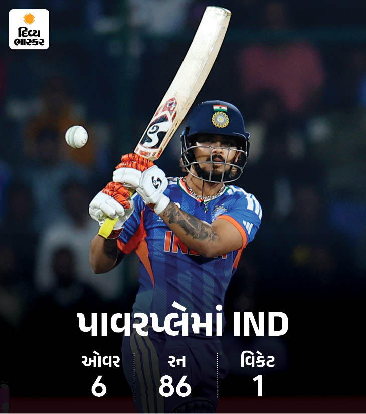 ટૉસ હારતા પહેલી બેટિંગ કરી રહેલી ભારતીય ટીમે વિસ્ફોટક શરૂઆત કરી છે. ટીમે શરૂઆતની 6 ઓવરમાં એક વિકેટે 86 રન બનાવી લીધા છે. ઈશાન-તિલક ક્રિઝ પર છે. ઈશાન કિશને પાવરપ્લેની છેલ્લી ઓવરમાં સતત 4 છગ્ગા અને એક ચોગ્ગો ફટકારીને ફિફ્ટી પૂરી કરી. તેણે માત્ર 20 બોલમાં હાફ સેન્ચુરી ફટકારી. સેમસન 22 રન બનાવીને આઉટ થયો.