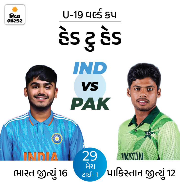 બંને ટીમ વચ્ચે U-19 લેવલ પર ઓવરઓલ 29 મેચ રમાઈ છે. જેમાં 16માં ભારત અને 12માં પાકિસ્તાનને જીત મળી છે. એક મુકાબલો ટાઈ પણ રહ્યો હતો. વર્લ્ડ કપમાં પાકિસ્તાને છેલ્લે સેમિફાઈનલ 2022માં રમી હતી. જ્યારે ટીમ ઈન્ડિયા 2016 થી સતત 5 ફાઈનલ રમી ચૂકી છે. ટીમે તેમાંથી 2 ટાઈટલ પણ જીત્યા હતા.