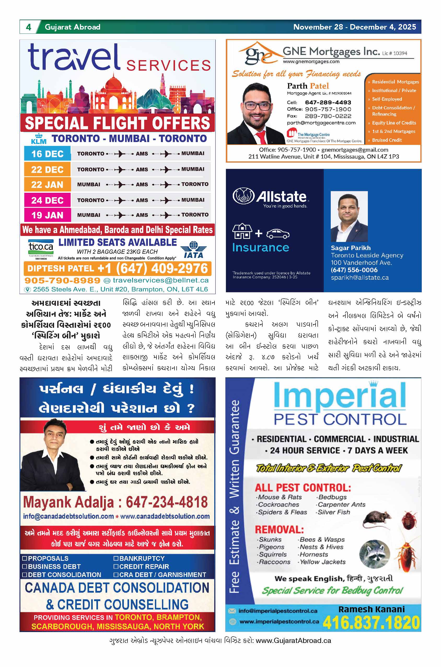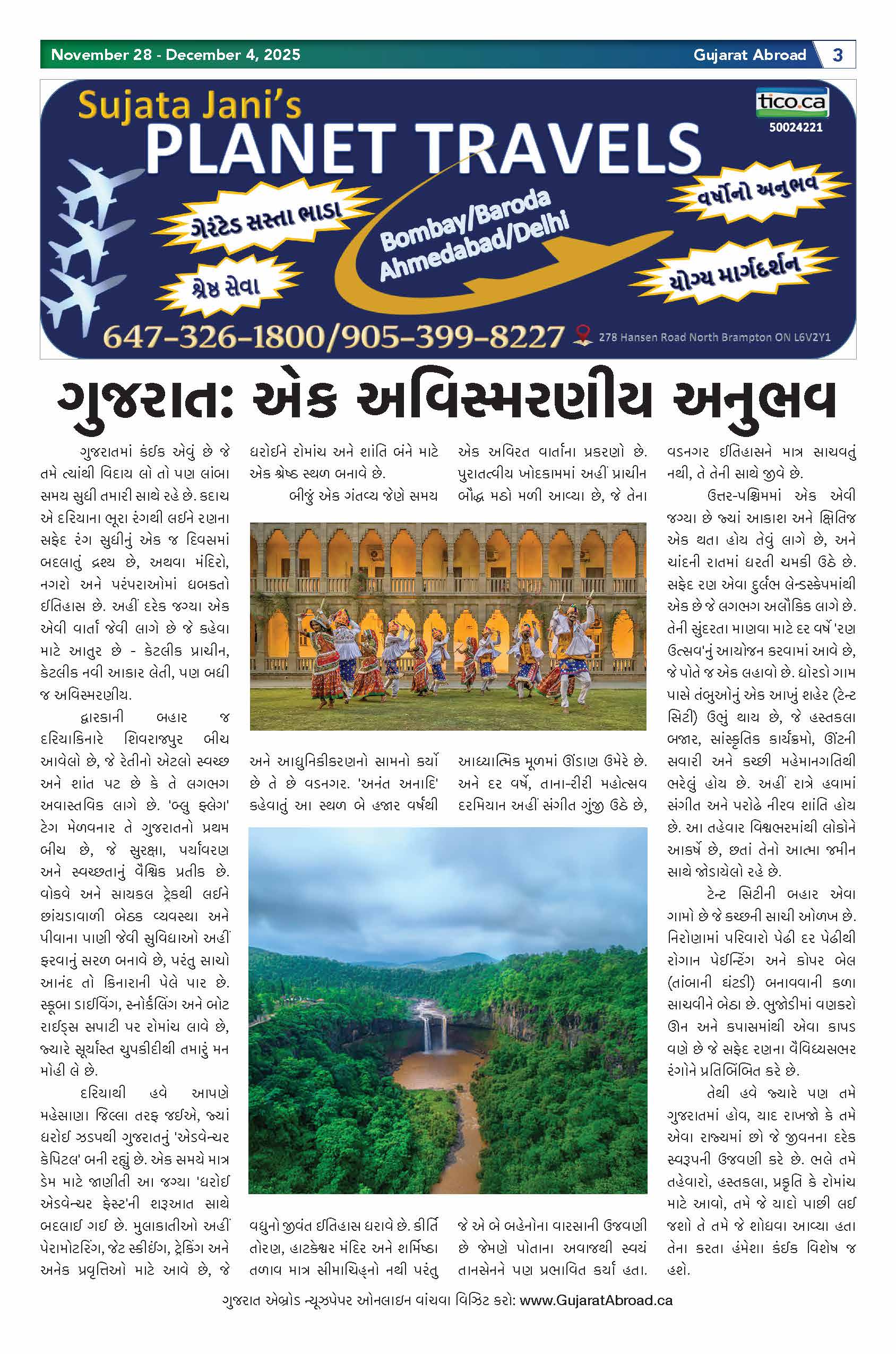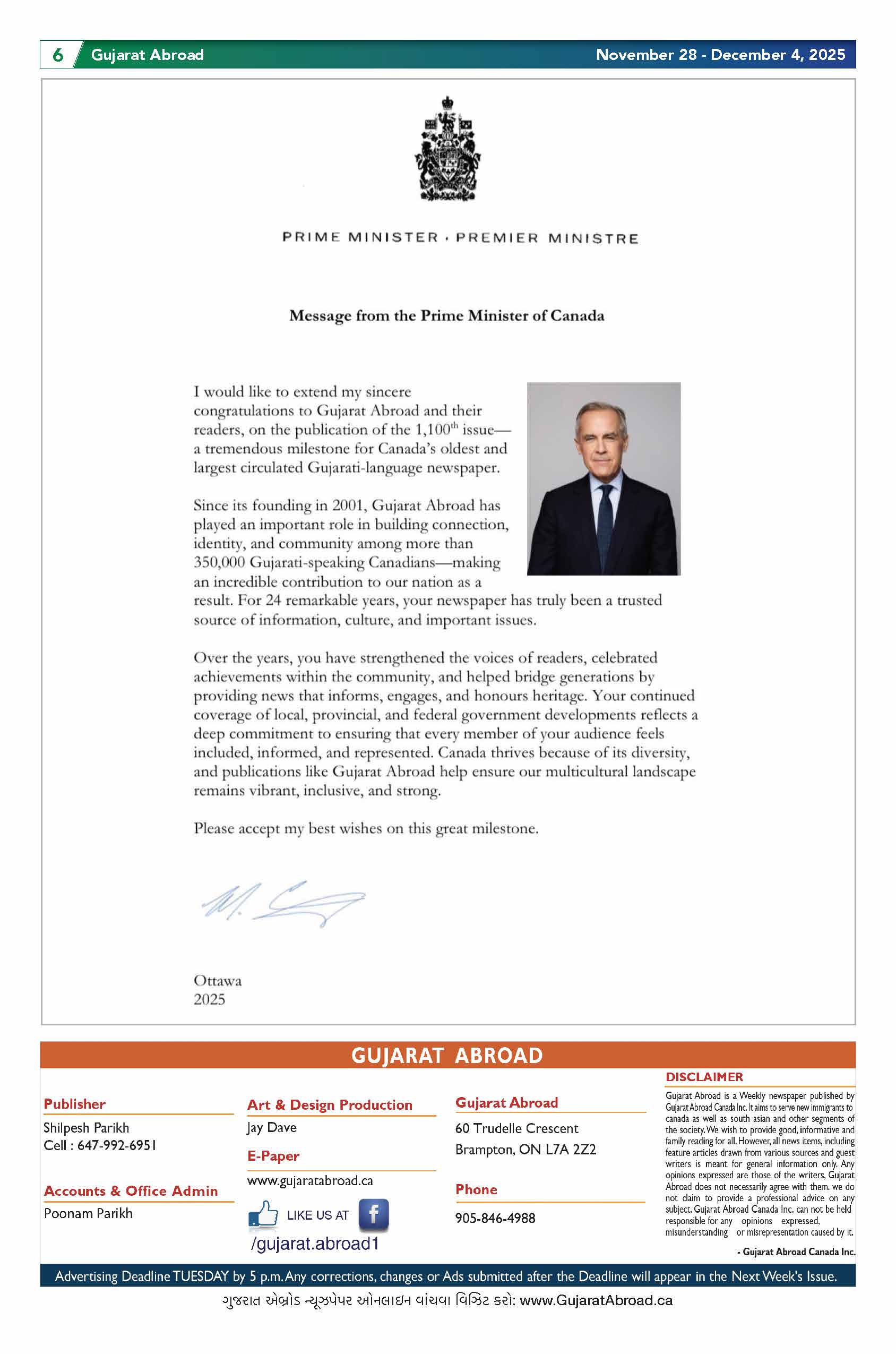 Gujarat Abroad is the largest circulated Gujarati Weekly Newspaper in the Greater Toronto & Surrounding Areas. Published from Brampton every Friday, Gujarat Abroad has a weekly print run of 15,000 copies, distributed free of cost through over 350 outlets throughout Toronto, Mississauga, Brampton, Markham & Oakville.
